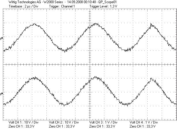 Dieser Thread ist exclusiv für die Bugs der Welec Firmware ;-) Version 1.3: Kann es sein, dass der PC Export immer noch nicht funktioniert? Entweder ist garkeine Datenübertragung möglich, oder die Daten werden falsch übertragen. Dann scheinen sowohl im PC als auch im Oszi die rechte und die linke Seite des Signals/Speichers vertauscht zu sein. Es scheint auch so, als ob manchmal ein schmaler "Streifen" der Zeitachse des Signals fehlen. Im Bild sieht man dass der dritte Scheitel des Sinus zu einem Dreieck wurde. Habt ihr sowas auch beobachtet, oder mache ich was falsch?