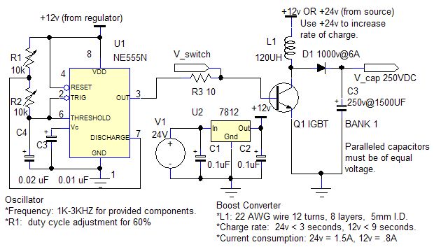 Kompleter Caca. Weshalb von 24 auf 12V runter ? Dass man nachher die groessere Spule benoetigt ? Ein IGBT, was soll der ? Das Ganze bringt nichts. In die Tonne damit.