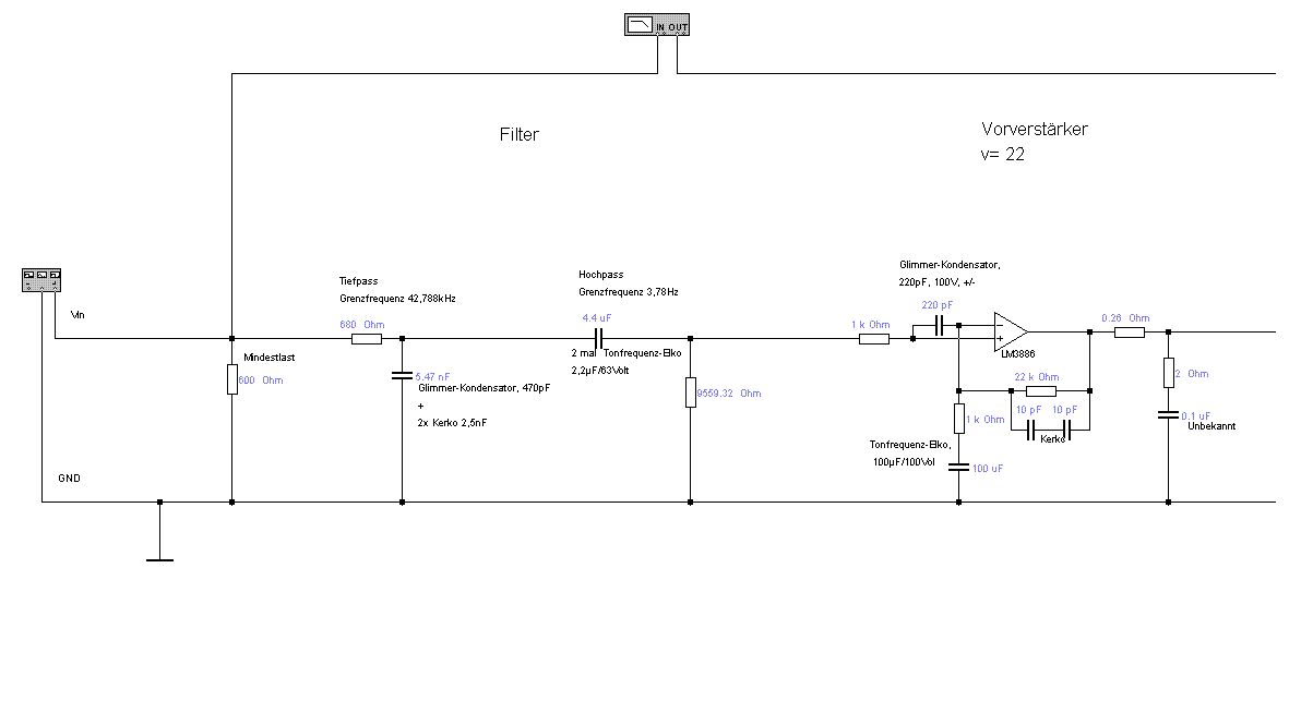 Gleich mal vorneweg: Podi ist grauenhaft. Es heißt Potentiometer -> Poti Aus welcher Region Deutschlands kommst du? > 3 0,5m 5m 5m Ab hier hört man schon > zu viel aber in Abhängikeit der Stellung des Podi Was hört man den zuviel? Rauschen, Brummen, Knacksen, ... > Die Messungen waren jetst mit meinem MP3 Player und jetst merke ich das > es wenn ich das Kabel in den Laptop einstecke die Boxen leicht pfeifen. > Es ist aber keine Brummschleife weil ich das Pfeifen auch höhre wenn ich > den Netzstecker ziehe. Eine Brummschleife hat auch immer 50Hz. gegen das Pfeifen würde ich mal den Tiefpass statt auf 42kHz auf 15kHz dimensionieren. > Aber ich glaube nicht das man dadran allzuviel machen kann. Aber sicher doch! Mein Lösungsvorschlag: den Vorverstärker ein Signal von 10V erzeugen lassen. Je höher die Spannung, desto unempfindlicher gegenüber Störgrößen. Vor dem Verstärker dann mit einem Spannungsteiler auf 1V herunterteilen. > Wegen dem Kabel. > Ich hab so langsam die vermutung das es nicht geschirmt ist. Das ist sicher nicht geschirmt. Steht ja auch nicht dabei. *Zu deiner Schaltung:* Wenn sie nach der obigen Modifikation auf 10V funktioniert, dann lass sie so. Für zukünftige Schaltungen aber ein paar Anregungen: Die LM3886 sind als Vorverstärker absolut überdimensioniert. Funktioniert trotzdem, ist nur teurer. Auf die Mindestspannung (Supply Min) von 18 Volt hast du geachtet? Die Mindestlast, falls überhaupt erforderlich sollte bei 10k liegen. Wofür sind in deiner Schaltung die 20 - 220 pF Kondensatoren rund um den OPV. Der 0,26R Widerstand gibt keinen rechten Sinn. Als Strombegrenzung müsste schon ein größerer dran. Die Kombination 2R und 0,1uF erschließt sich mir auch nicht. Das Poti ist in der Simulation kein 10k Typ, sondern ein 500R Typ. Die Grundlast kann entfallen, dafür wäre ein Tiefpass gut, um die eingefangenen HF Störungen rauszufiltern. Die Endstufe ist mir auch etwas suspekt. Sind die Endstufen zur Leistungserhöhung parallel geschaltet? Ein LM3886 schafft immerhin 11A! Das Boucherot-Glied ist wahrscheinlich falsch dimensioniert. Geschätzt würde ich was in der Region 15R + 40nF einsetzen.