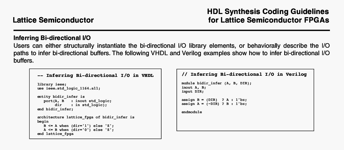 Dann übernimmt die Synthese automatisch die Instantiierung des Pintreibers (IOB). In Verilog müsste das doch so ähnlich auch gehen. Im Anhang ein Screenshot aus dem MachXO-Handbuch http://www.latticesemi.com/lit/docs/handbooks/HB1002.pdf