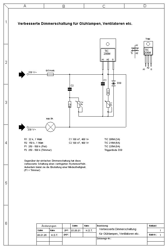 Hallo Forum, ich habe mir vorgenommen den im anhang gespeicherten Dimmer zu bauen. Habe mir einen Poti geholt der zusätzlich zum Widerstand noch einen Schalter integriert hat. Man kann also wenn der Poti ganz zugedreht wird noch einen Schalter betätigen. Nun gibt es da ein kleines Problem... Ich wollte den Schalter so in die Schaltung einbeziehen das nach möglichkeit die ganze Schaltung stromlos gemacht wird. Strom kostet halt och was :) Also evtl. gleich nach der Sicherung.... Der Schalter der an dem Poti dran is verträgt leider nur ne Leistung von 0,6W... da habe ich die befürchtung das der Schalter das nich aushält wegen der Leistung... ich will damit 3 Lampen mit 50W betreiben. Kann ich den Schalter ohne bedenken in die Schaltung mit einbauen oder riecht das dann im Betrieb verdächtig nach Strom? :) Oder habt ihr da vielleicht nen besseren Vorschlag... könnte ich zum Schalten der Versorgungsspannung noch nen Triac benutzen? Würde mich über eure Tipps freuen mfg Michael