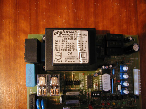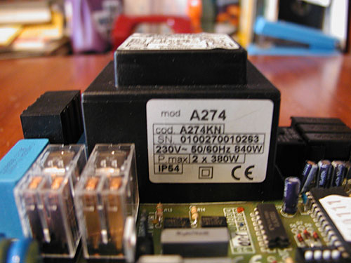 Das Schildchen mit den 2 x 380W bezieht sich wohl auf die Schaltleistung der Relais. Oben auf dem Trafo lässt sich was mit 20 VA erkennen. Wenn es mit einem neuen Trafo nicht geht, musst halt 2 nehmen. Einen mit 2 x 12 V und einen mit 24 V. Oder selber wickeln :-)