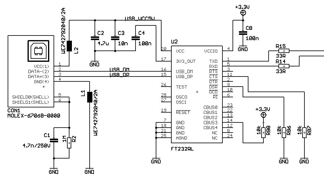 Oha, stimmt. TEST muss auf GND. Bei mir funktionierte es zwar trotzdem, das heisst aber natürlich nicht, dass es immer so sein muss. @gast: Leider ist der Anschluss an einen uC lediglich über Rx und Tx nicht als Beispiel im Datenblatt zu finden. Am ehesten kommt Fig. 7.2 in Frage. Dann funktioniert es aber nicht, da DTR und DSR offenbar dem FT232 signalisieren müssen (=low), dass der uC empfangsbereit ist.