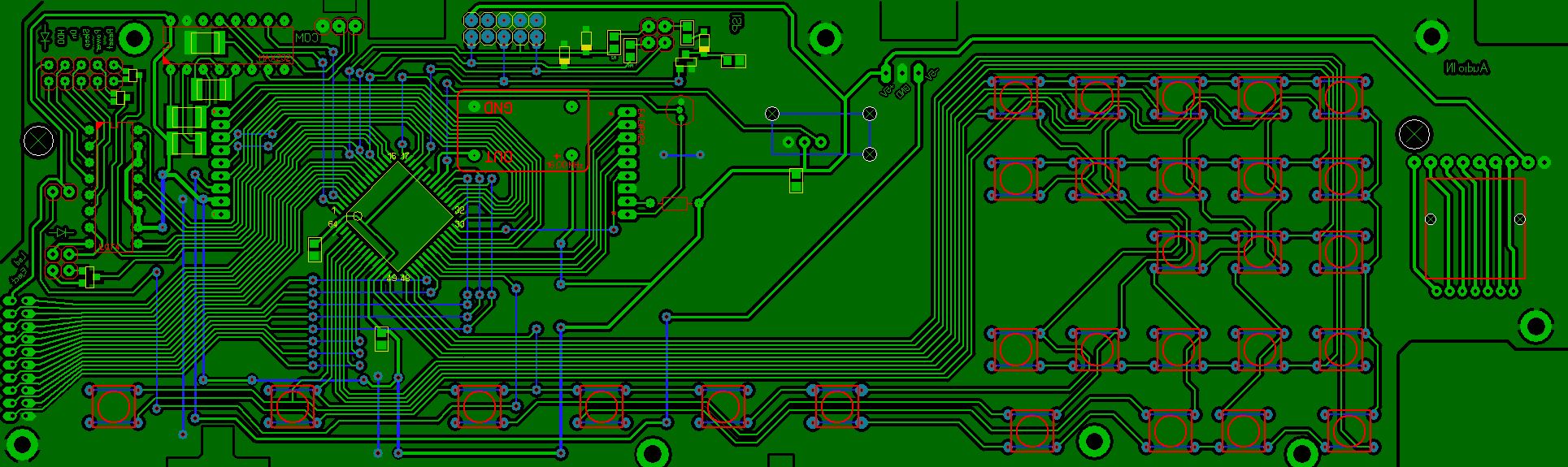 Der Schaltplan zur Platine wäre beim Durschauen hilfreich. Ich hab die Pinbelegung von den verwendeten ICs nicht im Kopf, und ich glaube den meisten hier im Forum geht es ähnlich. Und extra im Datenblatt nachschauen, welcher Pin welche Funktion hat ist ein relativ großer Aufwand. Und noch ein Tipp: ich hätte den ATmega128 nicht um 45° gedreht angeordnet. Bei manchen Layouts hat eine 45°-Drehung Sinn, weil die Leiterbahnen dadurch kürzer werden oder weil man so den Platz unter Umständen besser ausnützen kann. In diesem Layout ist es allerdings sogar eher kontraproduktiv, weil die meisten Leiterbahnen länger werden, und die Leiterplattenfläche trotzdem nicht besser ausgenutzt wird.