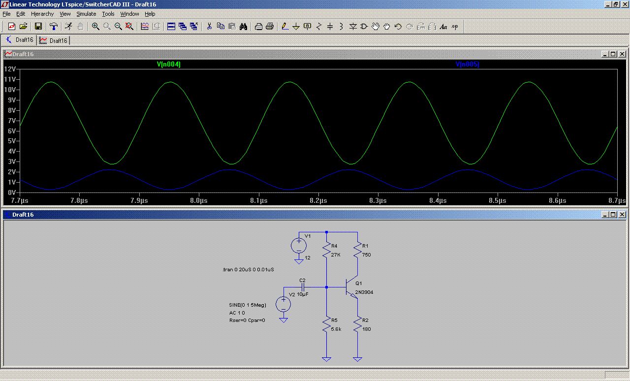 @Florentin S. Die Verstaerkung deiner Stufe sollte jetzt 535 Ohm / 130 Ohm = 4 sein. auch nicht viel anders als meine berechnung 750 / 180 = 4 Du hattes in deinem ersten Fall das Signal abgeschwaecht um den Transistor nicht zu uebersteuern. In den beiden letzten Faellen ist die Stufe so angepasst das sie bei deinem 1V Signalpegel nicht uebersteuert. Viel mehr Verstaerkung wirst du jetzt aber auch nicht rausholen koennen die Betriebsspannung setzt dir da eine Grenze. Und mit dem 535 Ohm Kollektorwiderstand hast du jetzt eine hoehere Grenzfrequenz also deine 3dB setzen spaeter ein. Mal die Frage wofuer brauchst du die Stufe jetzt ? Zu dem Kondensator kann ich mich HildeK anschliessen. Ich mach das auch immer so Elko und parallel ein Keramik C Gruss Helmi