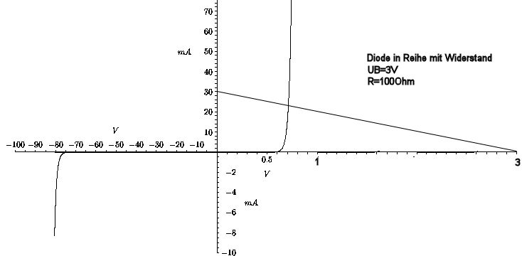Ja, so sieht das aus. Je größer der Widerstand wird, desto flacher wird die Widerstandsgerade (die Kombination aus der 3 V-Spannungsquelle und dem Widerstand R nimmt dann immer mehr den Charakter einer STROMquelle an, mit 3 V/R als Quellenstrom). Der Schnittpunkt der Graphen ist der Arbeitspunkt. An ihm kannst Du den Diodenstrom und die Diodenspannung ablesen, d. h. der Strom, der unter den gegebenen Bedingungen durch die Diode fließt und die Spannung, die an ihr abfällt.