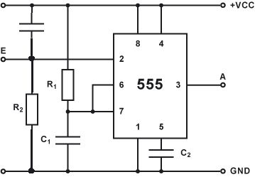 Schau dir mal diese Grundschaltung an und lege da vom Eingang E nach GND ein C an. Ev. noch eine Diode parallel zu R2 (Kathode an VCC) um nach dem Ausschalten auch schnell wieder bereit zu sein (um dieses C schneller als nur über R2 zu entladen). Vielleicht reicht das schon - ich habe schon lange keinen 555 mehr verwendet.