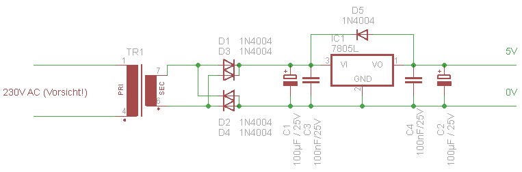 Hallo Lenovo, bei der von Dir gefundenen Schaltung handelt es sich um einen einstellbaren Spannungsregler. Am Anfang der Schaltung hast Du C1, einen grossen Kondensator welcher der zuvor gleichgerichteten Spannung die Welligkeit nimmt. C2 ist ein kleiner Kondensator am Eingang des Spannungsreglers, ebenso wie C4 das am Ausgang darstellt. Diese Kondensatoren (C2 und C4) sollen das Schwingen des Reglers verhindern. C5 ist ein Stützkondensator für die geregelte Ausgangsspannung. Typische Dimensionierungen sind: C1 = 1000µF pro A Ausgangsstrom C2 = C4 = 100nF C5 = 10 bis 100µF R1 und P1 bilden einen Spannungsteiler dessen Abgrisspanunng von C3 stabilisiert wird. Diese Spannung dient dem Regler als Rückkopplung um die Ausgangsspannung jederzeit korrekt nachregeln zu können. An P1 stellst Du auch die gewünschte Ausgangsspannung ein. D2 schützt den Spannungsregler für den Fall, dass die Ausgangsspannung grösser wird als die Eingangsspannung. Wenn Du nur 9V und 5V benötigst gibt es diese Längsregler (so wie er hier in einer Adj.-Version verwendet wird) auch als Festspannungsregler. Da baust Du den vorderen Teil ganz genauso (also Gleichrichter, C1, C2) dann nimmst Du einen Festspannungsregler. Den Spannungsteiler mit D1, R1, P1 und C3 lässt man da weg. Der Ausgang wird wieder identisch beschaltet also C4 und C5. Ebenso bleibt D2. Habe ich etwas vergessen? Grüsse Michael