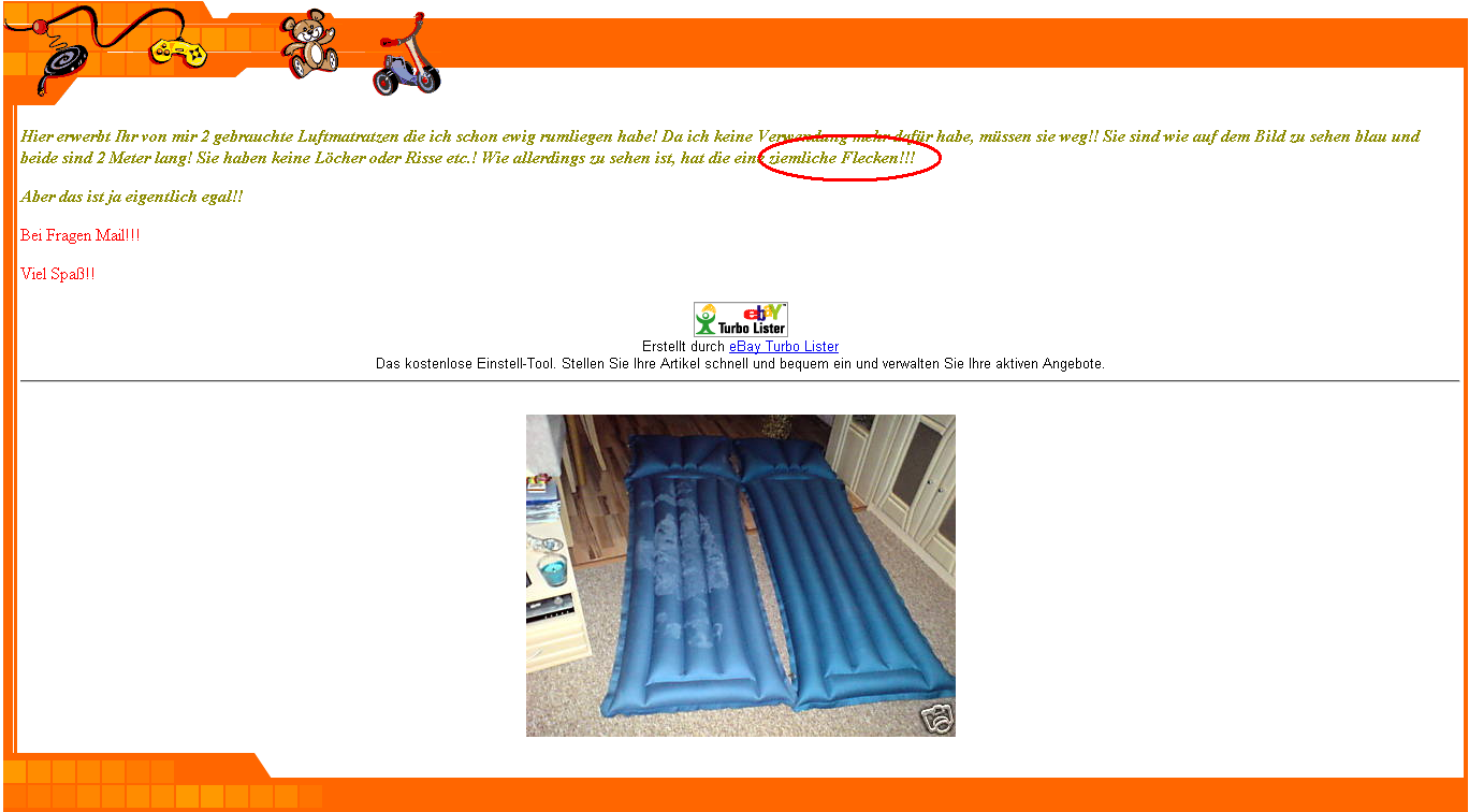 Die Suchmaschine von ebay findet den Artikel nicht. Wurde wohl entfernt oder wurde nie dort angeboten weil das Bild ein Fake ist. Aber da das Anbieten neuerdings nichts mehr kostet, könnte man es auch mit verwi* Matratzen versuchen.