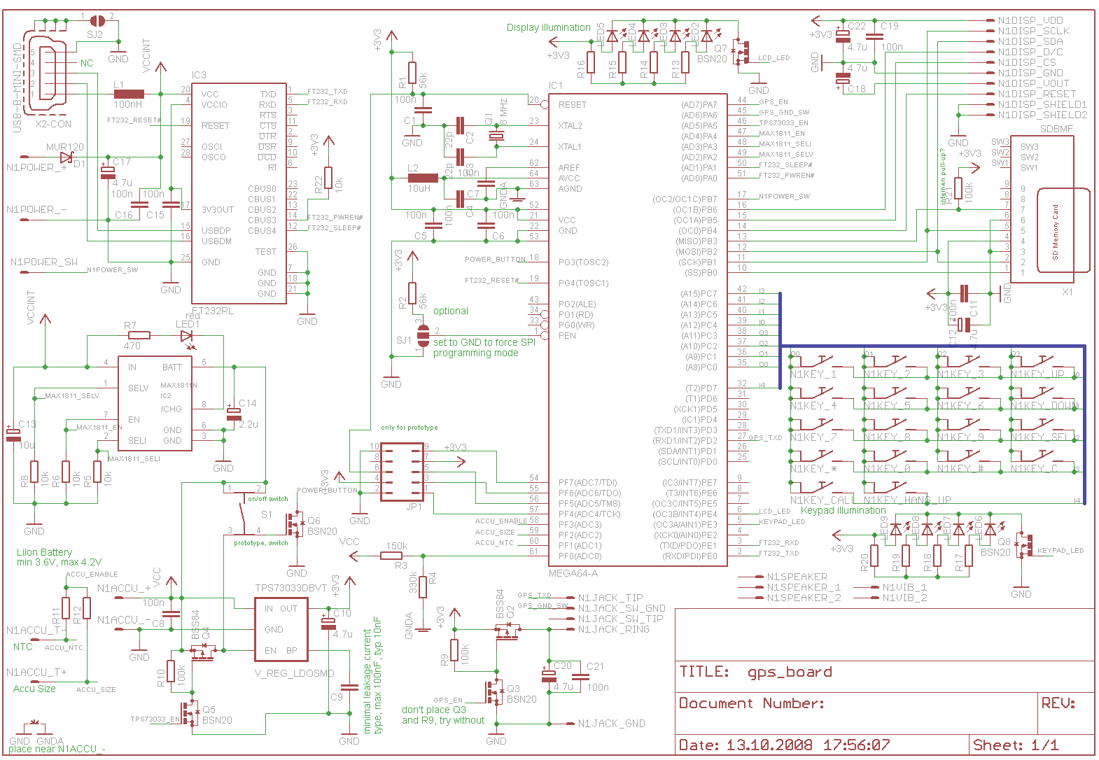 Hallo. Sitze jetzt schon etwas länger an meinem ersten etwas umfangreichem Schaltplan. Und da man sich alleine ja schnell mal verrent, wollte ich fragen ob Ihr da den ein oder anderen offensichtlichen Fehler findet bevor ich mit dem Layout anfange :) Das ganze soll ein GPS Empfänger werden der in einem Handy-Gehäuse untergebracht ist (N3310). Insbesondere geht es mir da um die Ladeschaltung und den FT232RL. Die sind für mich absolutes Neuland. Gruß psiyou