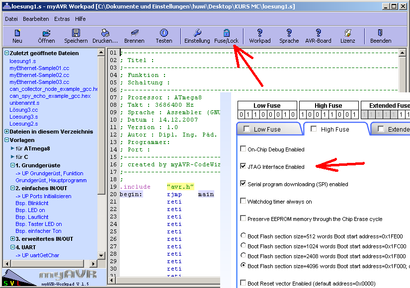 >Wie kann ich das in der myavr workpad plus >machen? Steht im Handbuch oder der Hilfe. Muss man nur mal lesen!