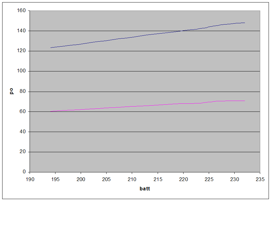 Ok, das sieht ziemlich linear aus. Also kannst du jetzt entweder mit Excel oder per Hand eine Regressionsgerade für po_min(batt) und po_max(batt) berechnen. (Guck mal in einem Mathebuch deiner Wahl oder bei google/Wikipedia für die Formeln. Ist im Prinzip ganz einfach, nur ein paar Summen bilden und dividieren.) Mit diesen beiden Funktionen kannst du ja für ein batt die enstprechenden po_min und po_max Werte ausrechnen und dann dazwischen linear interpolieren, wie du es oben bei der konstanten Batteriespannung gemacht hast.