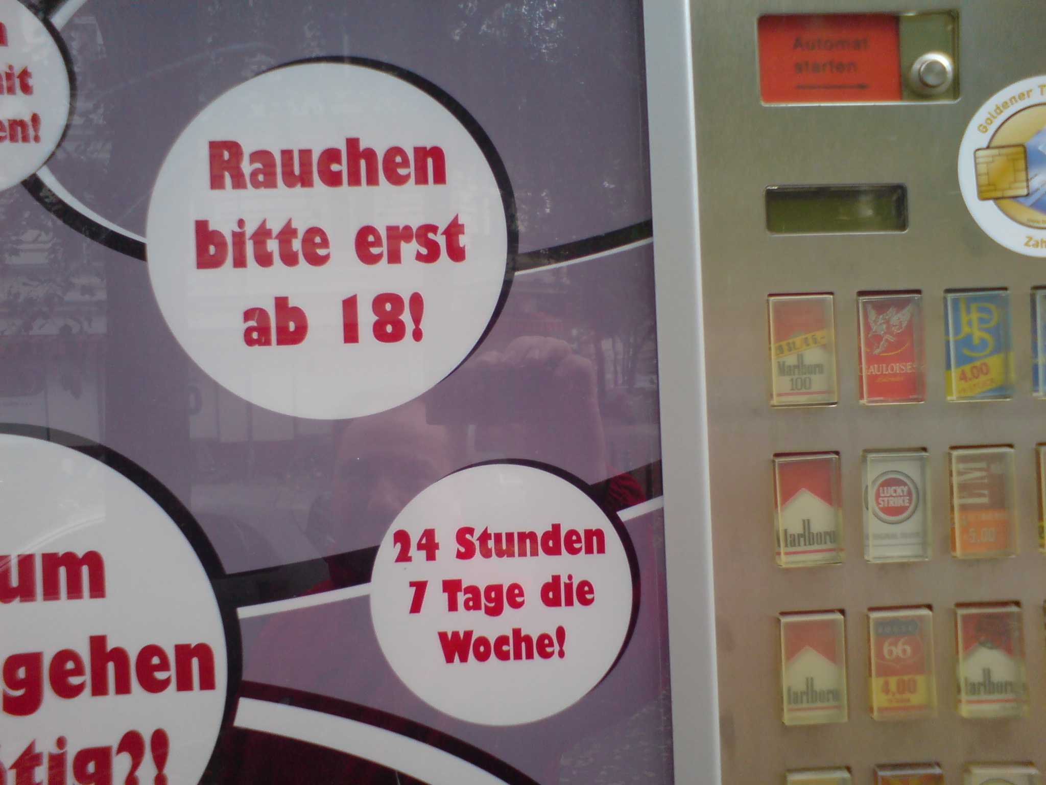 Weil da der Text "Rauchen erst ab 18!" so nahe an dem Hinweis "24h - 7 Tage die Woche!" (Welcher wie vieleicht schon bemerkt eigentlich die "Öffnungszeiten" angibt), man die assoziation gewinnen könnte das der Automat dazu auffordere/befehle (das Ausrufezeichen steht oft am Ende von Imperativ/Aufforderungssätzen steht), ab dem 18ten Lebensjahr doch bitte 24Stunden am Tag und 7 Tage die Woche zu rauchen. Und diese Aufforderung könnte man als nicht völlig grießgrämiger Zeitgenosse durchaus humorvoll finden. Muß man aber auch nicht...
