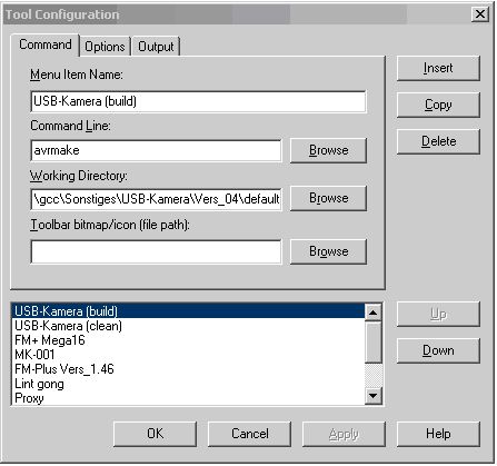 Wenn das make.exe vom WinAVR im Pfad liegt, ist die Einbindung in Ultraedit eigentlich recht einfach. Ich habe im Prinzip nur einen Eintrag im Toolsmenü und verwende den Parameter %modify% um kurz vor dem Kompilieren noch einen Target (clean, program, ...) an make zu übergeben. Mein makefile liegt immer zusammen mit den *.c und *.h im selben Verzeichnis. Das Working Directory vom Ultraedit wird auf das aktuelle Verzeichnis der Datei im Fokus gesetzt. Solange also eine Quelltextdatei oder das makefile im Editor den Fokus hat, funktioniert das. Menue Item Name: make Commandline: make %modify% Working Directory: %p Ansonsten unter Options noch: [x] Dos Program [x] Save all files first Unter Output: [x] Output to List Box [x] Show DOS Box [x] Capture Output Das ist einfach zu konfigurieren und einfach zu merken, falls ich mal wieder den Rechner neu aufsetzen muss. Ich benutze die Beispiel makefils aus dem sample Verzeichnes des WinAVR und modifziere sie so, das alle generierten Dateien in Unterverzeichnissen landen. Im Projektverzeichnis befinden sich somit nur die *.c, *.h, *.S und das makefile. Dadurch kann ich zum Starten vom Ultraedit alle relevanten Dateien ganz einfach mit "der Maus einfangen" und mit der rechten Maustaste im Kontextmenü Ultraedit starten. Damit spare ich mir das Anlegen von Ultraedit-Projektfiles. Funktioniert so für alle kleinen bis mittlere Projekte.