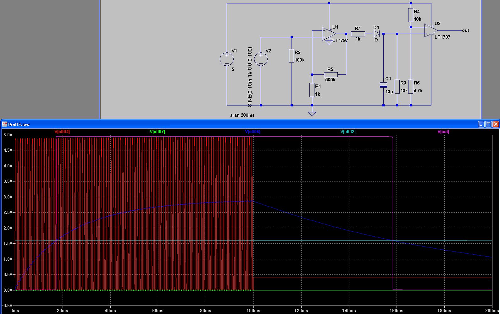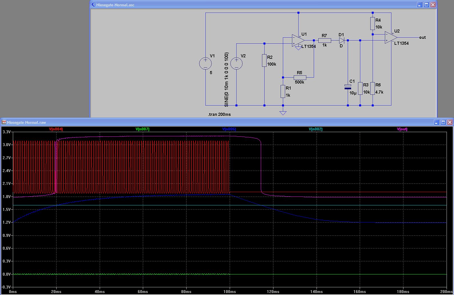 Also, ich hab das jetzt mal simuliert. Mit einem R2R-Opamp LT1797 sieht das wie im Bild aus. Da könntest du noch mit den Widerstandswerten spielen, und vor allem die Diode mal rein und wieder rausnehmen. Grün: Eingang 10mV Rot: Ausgang vom U1 Blau: nach D1 Magenta: Schaltschwelle (R4+R6) Lila: Ausgang U2 Zum Aufwand: Das hat mich jetzt 10 min. gekostet, echt. Und kost nix: SWCad von LT