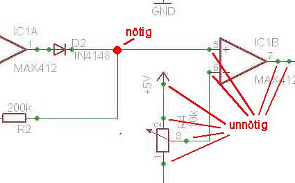 Auf die Gefahr hin, dass ich mich wiederhole (Eigenzitat): >> Der TL072 wird dir deine 10-300mV gar nicht verstärken. Also weder die >> positive, noch.... Dasselbe wird auch der MAX412 tun. Der MAX412 ist kein Rail-to-Rail OpAmp. Im Datenblatt zum selbigen steht bei +-5V Versorgung ein Gleichtaktbereich (Common Mode Range) von +-3,5V. Du mußt also bei dem Mäxchen auch 1,5V von den Versorgungsspannungsgrenzen (in deinem Fall +5V und GND) wegbleiben. Dein Eingang ist gleichspannungsmäßig auf GND, also ausserhalb der Spezifikation. Ein Tipp: Nimm die Suchfunktion hier im Forum und such nach "Rail to Rail". Die Diode (egal ob BAT oder 1N) kannst du weglassen, was soll die denn bewirken? Der Ausgang vom OP wird nie so negativ, dass die Diode überhaupt ans Sperren denken wird. Erst wenn du mir das schlüssig erklären kannst, darfst du sie wieder einbauen ;-) BTW: wo kommen denn die vielen Punkte her? Ein Punkt ist nur nötig, wenn ein Signal ein anderes trifft und dabei mit dem verbunden werden soll (also bei einem T oder einem +) PS: JPEG ist was für Fotos. GIF ist was für Schaltpläne. Sieh dir mal die schönen Artefakte in deinen Bildern an ;-)