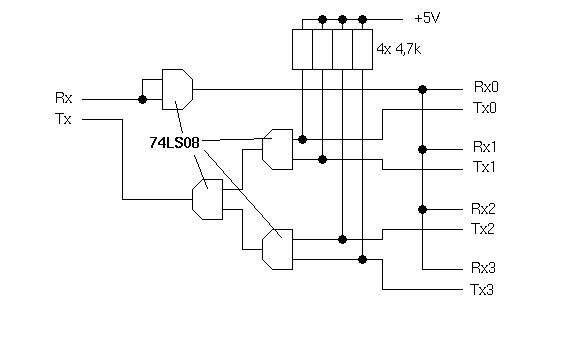@lippy Es geht wohl darum drei Slaves vie serielle Schnittstellen an einen Master anzuschließen. Im Ruhezustand sind TX und RX auf 1. @Student Mit nur zwei Oder Gattern lässt sich die Schaltung nicht nachbauen, weder in 3,3V noch in 5V.