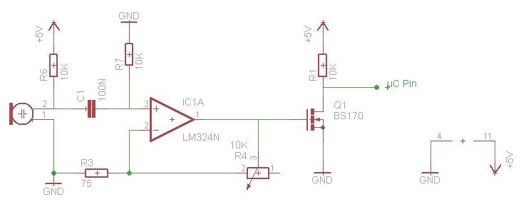 Hallo! Momentan bastele ich eine Stoppuhr die beim Überschreiten eines bestimmen Schallpegels gestartet werden soll. Der Digitalteil ist fertig aber am Analogteil hapert es gerade etwas, mit Operationsverstärkern habe ich mich vertraut gemacht und hoffe das ich die Grundsätze richtig verstanden habe. Danach habe ich die Schaltung aus dem Anhang auf das Steckbrett gebracht und es funktioniert. Die LED leuchtet wenn ich klatsche. Nun möchte ich aber eine Elektretkapsel verwenden im fertigen Gerät, da es ein Handgerät ist habe ich erstmal nur eine Unsymetrische Spannungsversorgung, momentan 5V aus einem 7805. Wenn es so weit ist soll ein Regler für Konstante 5v aus 2 NiMh Zellen verwendet werden. Die Kapsel besitzt schon einen Impendanzwandler, die Daten: Empfindlichkeit: 5,6mV/Pa/1kHz Ausgangsimpedanz: 2 k-Ohm Signal/Rauschabstand:> 34dB Koppelkondensator: 0,1-4,7µF Stromversorgung: 1,5-10V-/0,5mA Wenn ich jetzt aber das Elektret Mikro verwende geht es nicht, die LED leuchtet dauer, egal wie ich die Verstärkung über die Potis einstelle. Elektret mit 10K an 5v und GND, zwischen den 10K und dem Mikro über einen 100nF (größer habe ich leider nicht) Kerko das Signal an den nicht invertierenden Op Eingang. Wenn ich den Kondensator weglasse kann ich solange am Poti drehen das die LED ausgeht aber wenn ich in das Mikro puste geht sie nicht an. Wenn ich jetzt aber so weit dreh das die LED gerade sichtbar leuchtet dann wird sie heller wenn ich in das Mikro Puste. Ich kann mir darauf gerade keinen reim machen und verstehe nicht was dort genau passiert. Google und hier im Forum nachlesen hat mir leider nicht beim verstehen des Problems weiter geholfen. Mfg, Peter