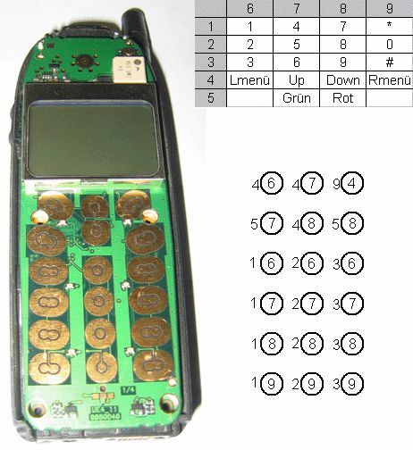 Hallo, hatte mal ein ähnliches Problem. Die Daten eines Mitutoyo Meßschiebers sollten über USB an ein Laptop als Tastencode geschickt werden. Die "Schnittstelle" ist eine Zifferntastatur mit opt. Maus drin. Auch in diesem Teil war eine Matrix zu schalten, mit Zeilen- und Spaltenleitungen. Der Tastaturcontroller ist eim EM78M611, Datenblatt s. ALLDATASHEET. Die Verbindung der Leitungen gelang mir mit einer Handvoll Transistoren, wobei immer der Transistor für die jeweilige Zeile und Spalte angesteuert werden. (Siehe Schaltplan) Das Ganze hat in der Tastatur noch Platz gefunden, so daß ich jetzt an der sowieso benötigten Tastatur/Maus-Kombination auch noch den Meßschieber anschließen kann. Vielleicht klappts auch mit dem Handy so.... ulf.