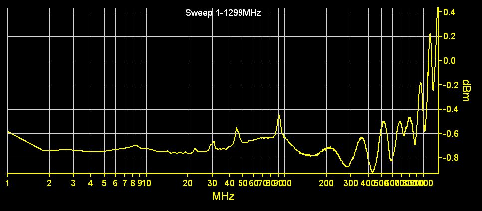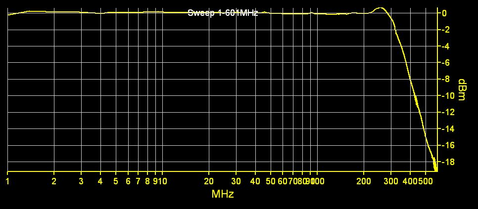... und hier noch zum Abschluss der Frequenzgang eines 36dB OpAmp Verstärkers aus zwei MAX4224, den ich mir vor einiger Zeit gemacht habe. Macht Spass, so einfach sehen zu können was abgeht. Mit dem Oszi ist es ja mühsam und bei 200MHz ist bei mir dann sowieso schluss.