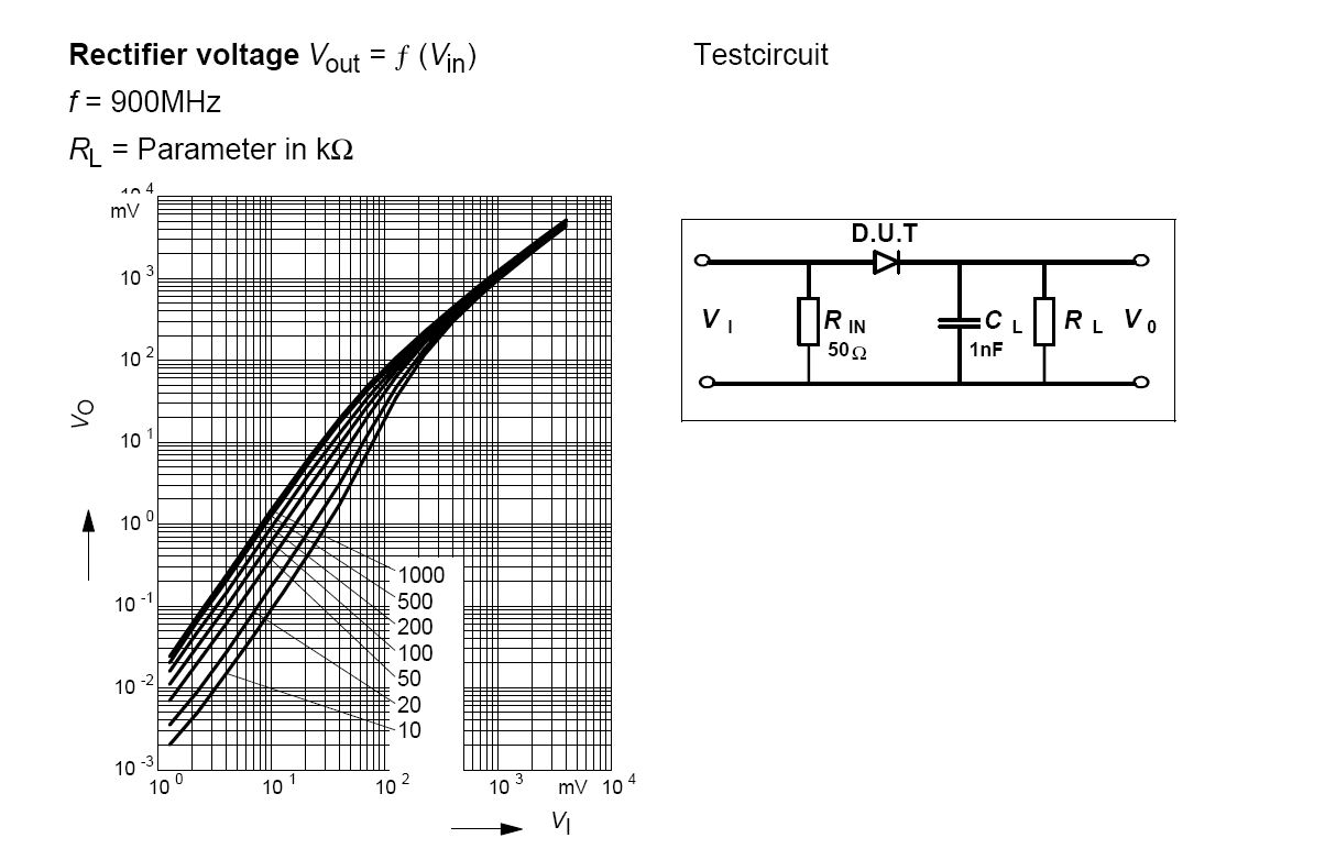 Vielleicht hier noch die Gleichrichter Kennlinie der BAT62. Ein -35dBm = 4mVrms Eingansignal wird nach der Kennlinie nach der Gleichrichtung zu ~ 200µV.