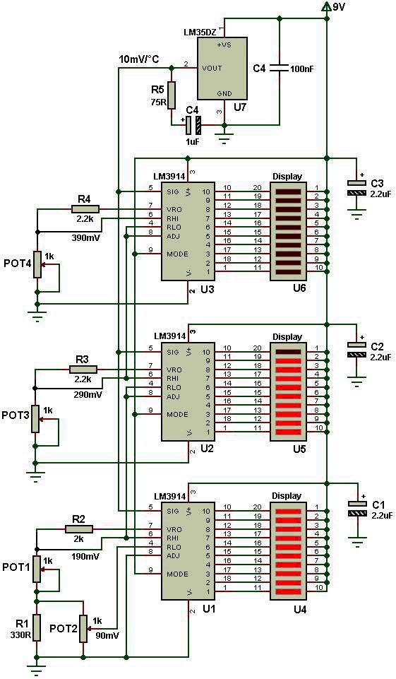 Hallo zusammen, Ich bin gerade dabei mir eine neue Lambdaanzeige mit 60 Segmenten aufzubauen, meine allte Anzeige hatte 20 Segmente und soll durch die neue ersetzt werden. Leider habe ich keine passende Schaltung gefunden und muss selbst etwas "entwerfen" bzw. vorhandene Schaltungen entsprechend ändern. Ich habe eine Schaltung in einem englischen Forum gefunden die als Temperaturanzeige dient. Leider passt diese Schaltung nicht ganz auf meine Bedürftnisse womit wir auch schon beim Thema wären; Ich möchte die Anzeige im Dot-Modus betreiben, also dass nur ein Segment an ist. Dazu würde ich einfach Pin 9 (Modus) mit Pin 1 des vorhergehenden LM3914 verbinden, so wie es auch im Datenblatt steht. Die restliche Schaltung würde ich so wie abgebildet belassen. Müsste ich noch was ändern um die Schaltung im DOT-Modus betreiben zu können? Das einzigste was ich noch nicht ganz verstehe ist "POT2" stellt man damit den Nullpunkt sprich den Anfangswert der Anzeige ein? Ich würde das jetzt so verstehen dass die Anzeige bei 90 mV anfängt und ein 10er Segment je 100 mV misst. Wenn die Schaltung bei 0 mV anfangen soll - muss dann an "RLO" bzw. POT2 einfach GND bzw. 0 V anliegen? das würde ja dann auch bedeuten dass sich die Spannungen für POT1/3/4 verschieben, also auf 100/200/300 mV oder sehe ich das falsch?