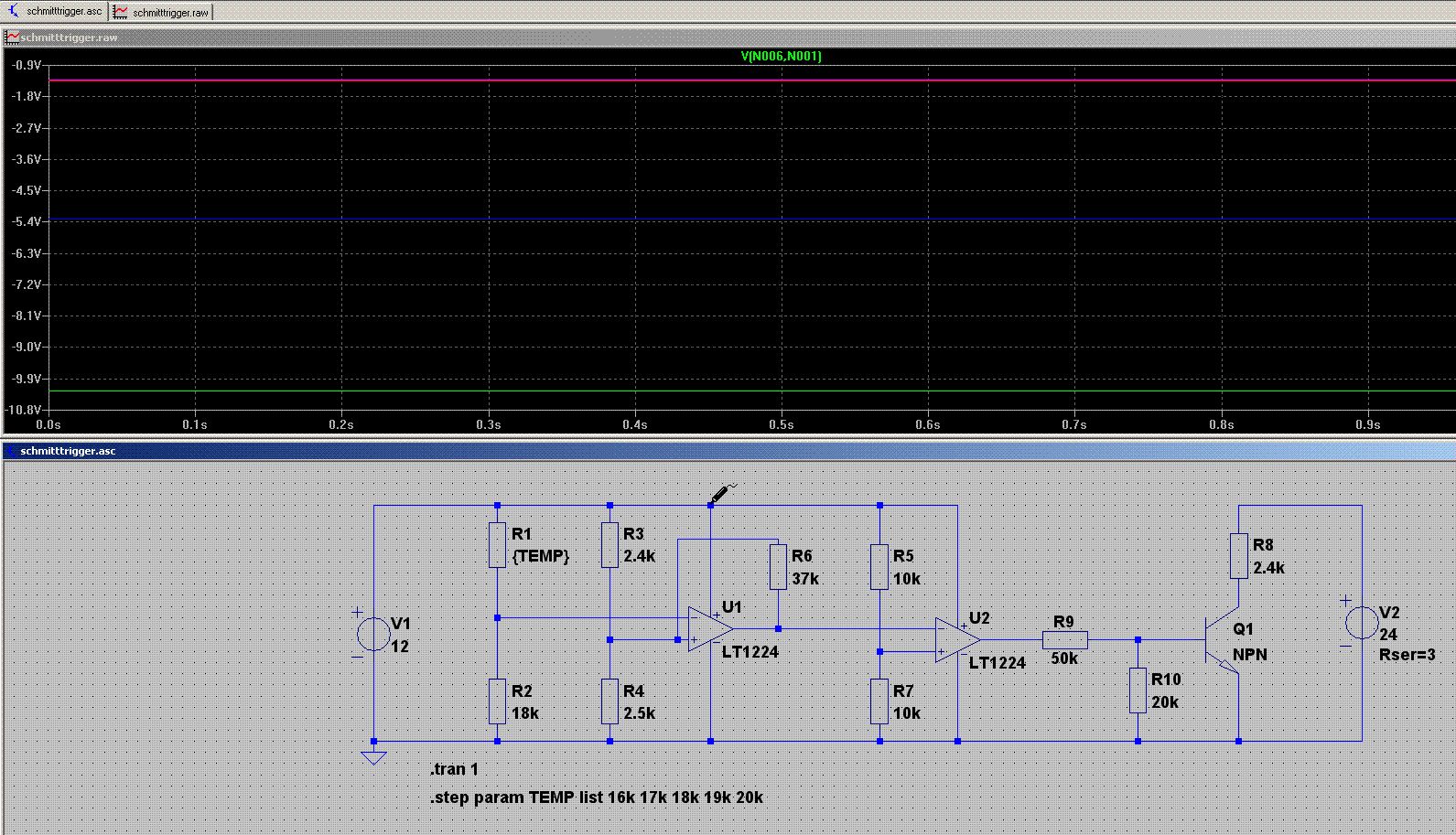 Hallo, bin neu hier und hab gleich mal ne Frage. Ich versuch schon ziemlich lange eine Schmitt Trigger Schaltung zu Simulieren, aber es will mir einfach nicht gelingen... Ich hab mal ne Schaltung angehangen die beim Überschreiten einer Temperatur schalten soll. Die Widerstandswerte hab ich schon berechnet und sollten soweit stimmen (hab mit den realen OPV Werten gerechnet). Ich erklär erstmal wie die Schaltung in meinen Augen funktionieren soll. Der erste OPV U1 ist für die Invertierte Schmitt Trigger zuständig... über Spannungsteiler kommen Referenz und Messspannung R4 ist nen Poti von 0 bis 5kOhm... der Temperatursensor ist denke ich zu erkennen... ich hab ihn mit nen paar Werten gespeißt die er in dem Temperaturbereich auch annimmt. (wenn jemand diesen Heißleiter kennt: ich such noch ne Kennlinie/ist von nem Kühlkörper einer Endstufe) Da das ganze eine Invertierte Schmitt Trigger ist, bekomm ich die gewünschte Spannung nur gegen +12Volt... was mir wenig bringt, da ich nen Transistor in einer anderen Spannungsebene schalten will... also einfach nochmal einen Invertierten Komperator hinter her (ich hab mir irgendwo den LM 393 ausgelötet, der hat auch gleich 2 OPVs in deinem 8 beinigem Gehäuse)... der Komperator bringt mir jetzt ca. 10,5 und 1,5 Volt raus. Da 1,5Volt schon etwas zu viel waren um den Transistor sperren zu lassen, hab ich noch einen Spannungsteiler nachgeschalten... Okay soweit meine Überlegungen... Jetzt zum Problem =) Die Schmitt Trigger arbeitet nicht richtig... jedenfalls nicht in meiner Simulation... wie man sieht gibt es auch Zwischenspannungen die am OP Ausgang anliegen... und das ist ja nun nicht wirklich Sinn der Sache... Kann mir jemand erklären warum? Ich hab die Schaltung schon so aufgelötet (alles vor der Schmitt trigger) und da arbeitet alles scheinbar nach meinen Wünschen...???¿¿¿ Bitte helft mir :) thx mfg Basti