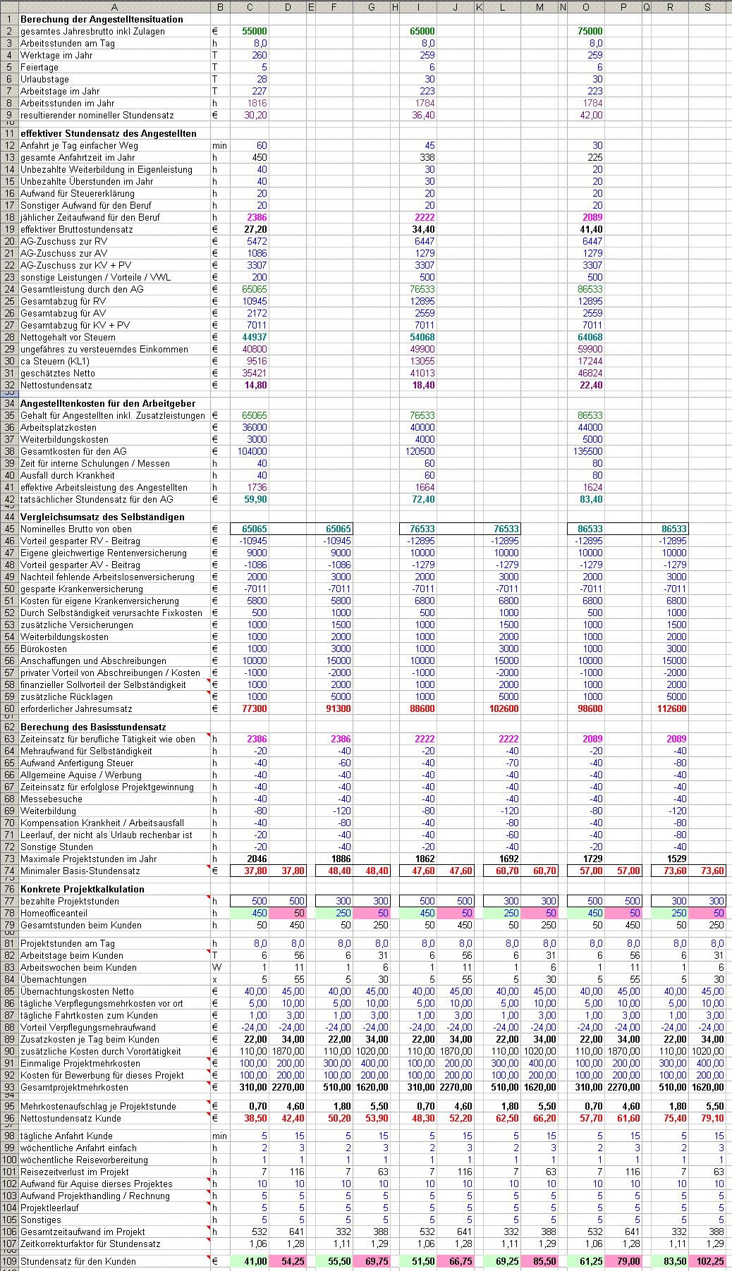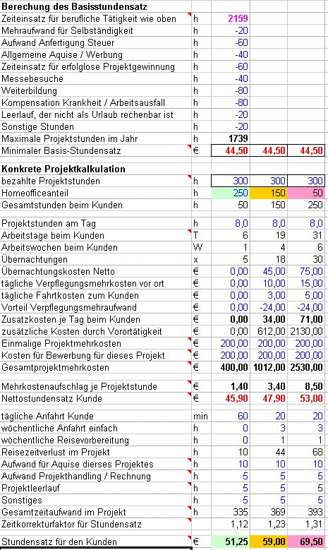 >@Kritiker: Deine Preiskalkulation ist ja ganz schön, aber welcher Kunde >zahlt denn einem 100% vorort-Projektarbeiter indirekt die Unterkunft >mit? Einige zahlen es sogar direkt mit :-) Letztlich muss er das zahlen, was nötig ist, um einen zu kriegen und wenn jemand weite fahren muss... >Das ist ja ein horrender Unterschied, ob man 60,- oder 70,- als >Endsatz hat/fordert. ??? Ist es, ja und bei 70 steigen die meisten Kunden aus. Irgendeiner ist immer billiger, mistens, wenn er aus der Nähe kommt. >Du setzt einfach 40,- pro Nacht an. Warst Du schon einmal in München? Man kann doch ansetzen, was man will. Meine Rechung ist doch nur ein Beispiel, was man fordern muss, damit sich so ein Projekt lohnt. Vielen ist nicht bewusst, für wie billig sie bei den Firmen arbeiten. Aber bitte: Hier nochmal ein Beispiel für ein Projekt in home office, eines mit 50% in der Nähe und eines mit teurem Hotel und weiter Anfahrt. Als Basisstundensatz habe ich mal nur das Aquivalent eines Ingenieurs mit 55k bei 35h genommen. Das ist eher wenig kalkuliert. Selbst der muss für home-office Stunden mindestens 50 Euro nehmen, bei 50% vorort fast 60,- und bei total und teuerem Hotel sind es bald 70,-. Und da ist nichts für schlechte Zeite hinzugerechnet und gerade 2 Wo Krankheitskompensation. Jeder der weniger bekommt, sollte lieber wieder Festangestellter werden!