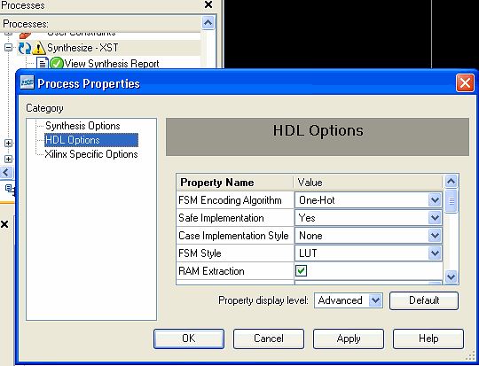 >Ich weiss, dieser FSM ist unsafe, aber selbst wenn ich zusätzlichen >Zustand hinzufüge und den FSM safe mache, bringt es nichts. Es ist Unsinn, eine SM "safe" machen zu wollen. Das heißt ja nichts anderes als: "Ich rechne damit, dass etwas schiefgeht, und definiere daher alle Zustände. Dann findet die SM immer einen Weg zurück." Augen zu und durch :-( Wichtiger ist es, die Eingangssignale für die SM "safe" zu machen. Und in der Praxis heißt das "Einsynchronisieren". In den Synthese-Properties gibt es die Möglichkeit, die SM safe codieren zu lassen (Bild). Diese (scheinbare) Sicherheit kostet aber ganz enorm Ressourcen. Als Beispiel: