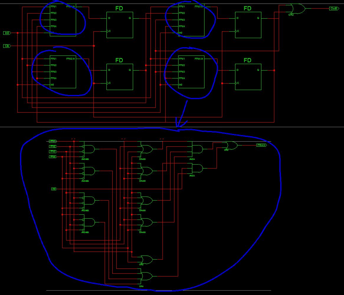 > when others .... > ist das bei One-Hot-Kodierung überflüssig ? Wenn jeder Zustand auscodiert wurde, macht when-others bei der One-Hot-Codierung mit abgeschalteter "Safe-Implementierung" gar keinen Sinn. Da ist jeder definierte Zustand ein (1) FF. Der hier "gemeinte" when-others-Fall wäre also, wenn mehr als 1 FF aktiv wäre. Und diese Abfrage kostet immensen Aufwand, da dann ja alle FFs mit in die entscheidung einfliessen müssen (siehe dazu meine Screenshots). Die Safe-Option ist bei binär codierten SM einfacher zu implementieren, aber Mehraufwand ist es immer. Grundlegend ist ja wohl, dass üblicherweise when-others niemals erreicht werden darf. Und falls es doch dazu kommt, wie sollte denn dann reagiert werden? Und wie oft darf es dazu kommen? Darf dann einfach so weiter gemacht werden? Ein lustiger Trick ist übrigens bei Designs, die ab und zu nicht funktionieren, einfach mal eine andere Implementierung (z.B. binär statt one-hot) zu erzwingen. Wenn sich dann am Verhalten was ändert, sind idR. asynchrone Signale und Glitches dafür verantwortlich, nicht die SM an sich.