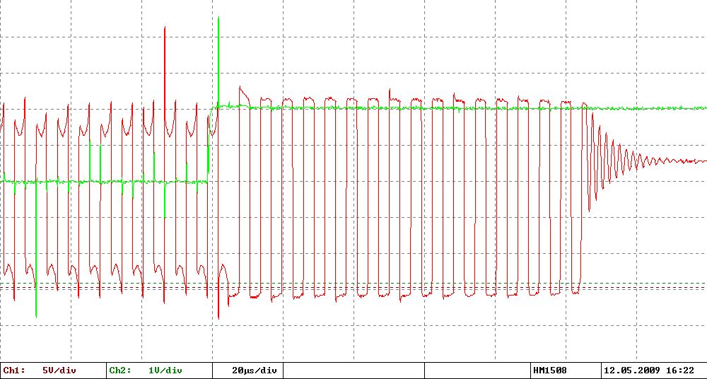 Habe mal versucht, die Gate- Spannung am Oszi zu messen, ist so ca. 9V! Offensichtlich stimmen also die Spannungen der als ZD12 nicht? Mit 2 ZD in Reihe hängen nun ca 20V am Gate. Die Klingelei hört aber leider nicht auf. Was mir dabei auffiel: vorher hatte ich sicherheitshalber einen 1k Widerstand in Reihe zum Oszi geschaltet. Zur Messung bin ich nun direkt mit der BNC- Leitung ans Gate gegangen. Jetzt sieht man eine Art Prellen nach der steilen Flanke zum H-Pegel. Der HF- Anteil der Rechteckspannung steigt mit steigender Betriebsspannung, ansonsten bleibt alles unverändert. Bei Zuführung des dämpfenden Eisenkerns wird die steigende Flanke flacher, d.h. die Oberwellen"rutschen" die Flanke hinab. Dann beginnt das Klingeln. Langsam habe ich den Verdacht, daß dann irgendwann beide Mosfets mal kurz auf EIN schalten können und dadurch die Probleme beginnen. Werde mal versuchen, die Leitungen von den Mosfets zur Spule(jetzt ca. 10cm) einzukürzen, vielleicht wird dann alles etwas sauberer. bis dann! ulf.