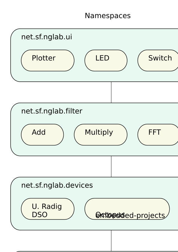 > Danke, ich werde Deine Plugins verwenden. > Wenn Du vielleicht schon mal den RCP-Rahmen aufsetzen könnest? OK, ein paar Sachen würde ich trotzdem gerne erst noch klären. Besonders die Frage vom Anfang: * Wie wird der Datenfluss geregelt: ** Läuft im Gerätetreiber ein Thread, der Daten durch die Verarbeitungskette bis zur Visualisierung schiebt? ** Läuft in der Visualisierung ein Thread, der Daten vom Gerät holt? ** Oder soll sich das Framework darum kümmern? * Wie sollen die Daten zwischen Device, Filter und UI ausgetauscht werden? ** byte[] ** InputStream / OutputStream ** eigene Objekte Im Anhang hab ich mal versucht die Namespaces etwas einzuteilen.