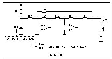 Hallo Montey Ich hab die Schaltung aus dem Tietze-Schenk mal praktisch aufgebaut. R1=1k, R2=2,2k, R3=1,2k für die Opamps die einfachen µA741 und als Betriebsspannung Plus-Minus 15V. Funktioniert recht brauchbar, obwohl meine Widerstände eine Toleranz von 5% haben. Die maximale Höhe des Widerstandes RL ist dabei 2,7k. Hier ein paar Messwerte: RL 0 Ohm 2,7k Ausgangsstrom linker Opamp 2,2mA 3,5mA Ausgangsstrom rechter Opamp 3,5mA 12mA Ausgangsspannung linker Opamp -2,5V -12V Eine Überlastung der Opamps kann ich hier nicht sehen. In die Leitungen zu den nichtinvertierenden Eingängen würde ich noch einen Widerstand mit der halben Größe von R2 setzen. Vorschlag für die Opamps LF412 oder OP177. Bevor Du Dir super teuer Widerstände kaufst, versuch es doch erst einmal mit 1% Metallfilm. Viel Erfolg Ulrich