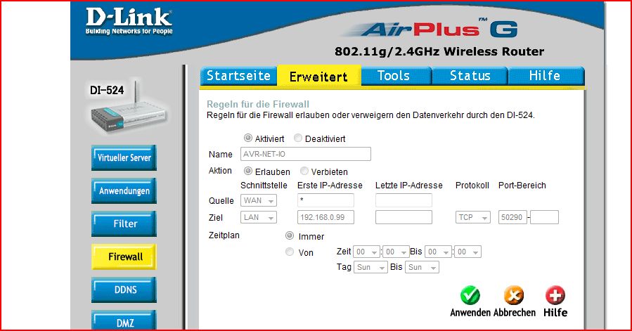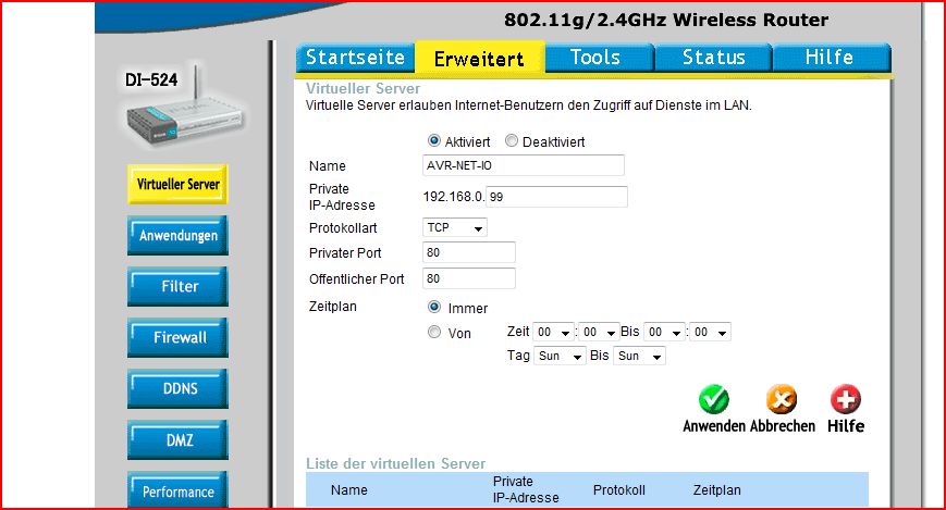 Soo, da ich die Diskussionen im Thread "AVR für wenig Geld im LAN" nicht stören wollte, habe ich mich dazu entschlossen, diesen neuen zu öffnen. Ich habe auch ein AVR-NET-IO mit der modifizierten Software von U. Radig am laufen, aber auf den Server möchte ich natürlich auch von auserhalb zugreifen. Hab mir schon ne DynDNS besorgt und eingestellt. Mir fehlt nur noch eine Info die ich bisher nirgends finden konnte: Den Port am Webserver, auf den ich das Port-forwarding einstellen soll. Wäre net wenn mir jemand helfen könnte Gruß Jochen