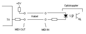 Danke für die schnelle Antwort! Habe jetzt ein bisschen recherchiert und so allerlei zum Thema Midi-Eingang und Optokoppler gefunden, aber leider nichts 100%ig verwertbares. Wie ich das verstehe, kann man den Optokoppler auch weglassen, wenn man die Midi-Leitung einer Soundkarte ansteuert (hilft hier wohl nicht weiter). Bei mir soll zunächst zum Ausprobieren ein altes Roland Keyboard JW-50 über Midi-In angesteuert werden (Diodenstecker). Der Expander selber ist bis jetzt noch nicht einsatzbereit. meine Vermutung: TXT über 220R auf Optokoppler-In gegen Masse, Optokoppler-Out auf Pin5 Keyboard gegen Masse, ausserdem +5V über 220R auf Pin4, ist das so korrekt??? (ausserdem Schutzdiode mit Anode von Masse zum OpKo-Eingang) Hat vielleicht jemand einen link für die korrekte Beschaltung zur Hand? Wenn man eine Note mit folgenden Werten übermitteln möchte ( NoteOn), würde das dann so aussehen: (?) Kanal: 3 Notennummer: 57 Anschlagsstärke: 102 1. Byte: 3 + 128 = 131 2.Byte: 57 + 0 = 57 3.Byte: 102 + 0 = 102 (0 bedeutet 7.Bit "0") Und wie übermittlet man den Befehl NoteOff? (2. Byte = Notennummer, 3. Byte=Ausklanggeschwindigkeit) Irgendwo muß ja im Statusbyte mit den unbenutzten Bits mitgeteilt werden, um welchen Befehl es sich handelt, oder reicht der erneute Aufruf der gleichen Notennummer dafür aus?