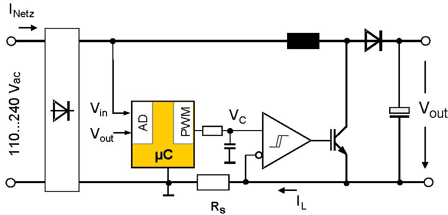 Im Beitrag Beitrag "PFC - Schaltplan" wurde eine Webseite von Fraunhofer genannt, nämlich http://www.iisb.fraunhofer.de/de/arb_geb/les/pfc.htm. Jetzt habe ich mir gedacht, das könnte man doch auf der Sekundärseite eines Trafos hinter den Gleichrichter "kleben". 1. Die Schaltung auf der Webseite (ist das angehängte Bild) arbeitet direkt hinter der Netzspannung. Ergibt sie auch hinter einem Trafo noch einen Sinn oder verzerrt der zu stark durch Magnetisierungsverluste oder so die Kurve der dann "ohmisierten" Last? 2. Das ganze ist im Prinzip ein Step-Up-Regler. Wie berechnet sich nun die Schaltfrequenz, aus der Zeit, die der Komparator zum Umladen des Transistors braucht? Ach ja, das ist doch ein FET, oder? Das Zeichen ist mir nicht geläufig... Oder wird die Schaltfrequenz von Spule und Hysterese bestimmt? 3. Wenn ich das richtig interpretiere, dann wird der FET durchgeschaltet, der Strom steigt, der FET wird gesperrt, kein Strom fließt, der FET ist ständig am Umschalten. Sind das nicht üble Schaltverluste am Transistor? Oder sorgt wie ich oben vermute die Spule dafür, dass sich der Strom nicht so schnell ändern kann? Ich hoffe die Fragen sind nicht zu blöd, hab halt noch keinen Schaltregler aufgebaut, höchstens mal in LTspice IV simuliert. Nur diese Schaltung krieg ich irgendwie nicht rein ins Spice... Ach ja, und bringt mir die Schaltung überhaupt etwas, muss ich dann nicht mehr den Trafo riesig überdimensionieren?