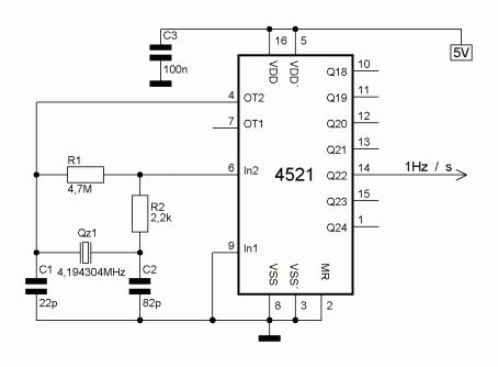 Hallo Leute, Ich versuche zur Zeit eine Cmos Digitaluhr aufzubauen. (http://blackstrom.derschwarz.de/schaltungen/digital_uhr/index.shtml) Nun habe ich mit dem Taktgeber angefangen, ihn nach Schaltplan aufgebaut. Die Funktionsweise ist mir eigentlich schon klar. Die Frequenz des Quarz wird durch 2^22 geteilt am Pin 14 des 4521 bereitgestellt. Hab das Ganze auf einem Steckbrett aufgebaut, betreibe die Schaltung mit 3Volt (laut Datenblatt des 4521 okay). Nun müsste ich doch einfach am Ausgangsport 14 mit einer LED (+Vorwiderstand) die Zustände "1" und "0" im 1Hz Takt darstellen können.. Ausgangsstrom bis zu 10mA/Pin liefert der 4521. Leider passiert garnichts. Was mach ich falsch ? danke für eure Hilfe