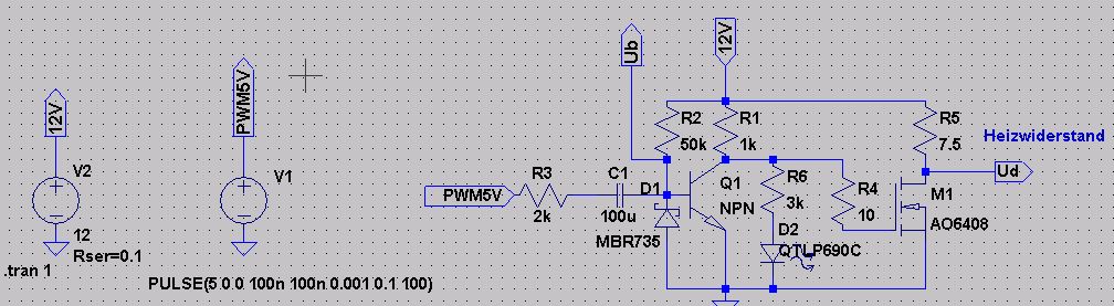 Soll der Heizstab mit PWM angesteuert werden - wenn ja: mit welcher Frequenz? Wenn der Heizstab nur ein oder aus geschaltet werden soll, oder eine PWM mit niedriger Frequenz (weniger als 30 Hz) betrieben werden soll, kannst du eine Schaltung nehmen, wie im Anhang. Die kapazitive Kopplung kannst du weglassen, wenn die Heizung bei ausgefallener PWM mit 100% heizen darf. Dann läßt du einfach R2, R3, C1 und D1 weg. Die Schaltung invertiert: Wenn high am Eingang steht, ist der FET gesperrt - man muß also die PWM invertieren. Die Halbleitertypen sind unkritisch - es müssen nicht die aus dem Schaltplan sein, denn das sind nur Verlegenheitsauswahlen aus der LTspice-Bibliothek. Mit BC337 und BUZ11 funktioniert es prima.