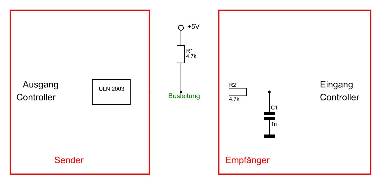>Das ist eh kein Filter. Dazu müsste R1 vor R2. Eine bessere >Störsicherheit erreichst du einfacher durch Verkleinerung von R1. Ich habe das Schaltbild abgeändert. R1 ist jetzt vor R2, und nebenbei spar ich mir noch ein paar Widerstände, in dem ich sie auf den Empfängerplatinen komplett weg lasse und nur noch ein zentraler PullUp irgend wo in die Busleitung einfüge. Oder ist das bei ca. 2-3 Meter Busleitung nicht ratsam? Ich habe den Wert von 100k auf 4,7k verringert. R1 war ursprünglich wegen dem ungewollten Spannungsteiler so hoch. Das fällt ja jetzt weg.