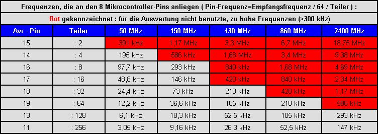 Michael U. wrote: > Die 2. Hälfte des 393 ist mir noch völlig unklar, hängt mit Eingang und > Ausgängen am Controller... Der "geteilt durch 16" -Ausgang des 74HC393 führt auf den clk2-Eingang am selben IC. Durch diese Verschaltung hat die "2. Hälfte" des 393 die Teilerausgänge :32 :64 :128 und :256 ... und liefert an den Pins (18,19,13,11) des AVR folgende Frequenzen: Pin 18: Empfangsfrequenz /64 /32 (=Empfangsfrequenz/2048) Pin 19: Empfangsfrequenz /64 /64 (=Empfangsfrequenz/4096) Pin 13: Empfangsfrequenz /64 /128 (=Empfangsfrequenz/8192) Pin 11: Empfangsfrequenz /64 /256 (=Empfangsfrequenz/16384) Folgende Tabelle (siehe GIF-Grafik im Anhang) zeigt die Frequenzen, die an jedem einzelnen der acht Mikrocontroller-Pins anliegen.