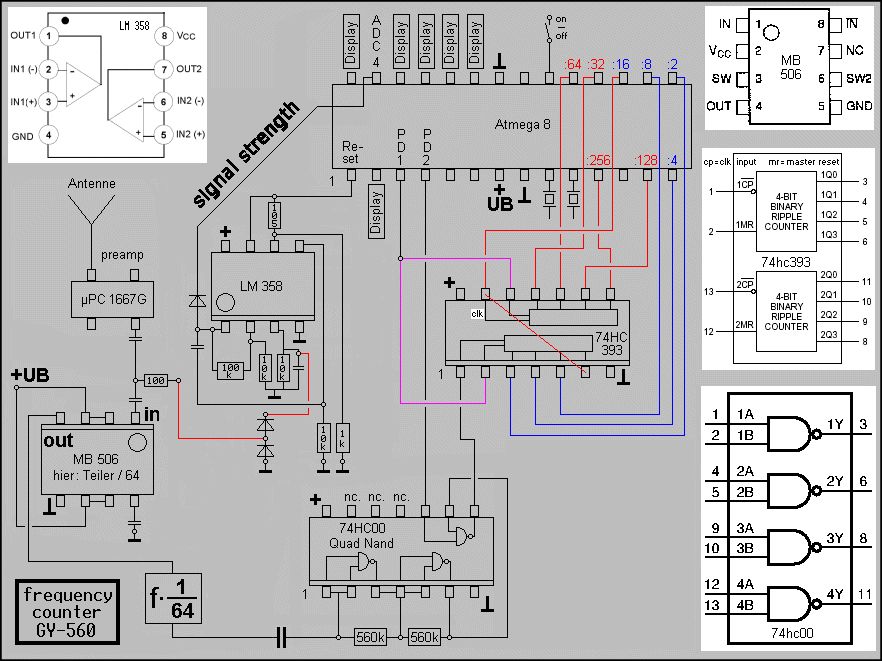 Ich habe es genauso steckbar gemacht. Bascom kennt kein 8*2 Display, das 16*2 ist aber voll kompatibel. Ich habe den 393 ausgelötet, ich brauche die Pins vom Atmel. Habe jetzt ein Mega88 eingesetzt, der ist auch ohne 393 als Vorteiler schnell genug. Mit 20Mhz Quarz, und den 506 als 256 Vorteiler statt 64 reicht das auch so bis 2,5Ghz. Den Draht von mir am 506 kann man ja auf dem Foto gut sehen. Ich habe sogar ein 22,1184 Mhz Quarz genommen, ist besser für die Baudraten erzeugung, falls ich die Serielle benutze, denn TXD ist ja nun auch frei geworden. Ausserdem habe ich noch RS vom Display von Port C5 nach Port B0 verlegt, weil ich einen Analogeingang frei brauchte, um die Batteriespannung zu messen. Ach ja die Led die man auf dem Foto sehen kann, ist an Pin 7 vom LM358 über 620 Ohm an Masse,und flackert immer schön mit bei Empfang. Sehr nützlich. Ich habe den Schaltplan jetzt auch in Eagle neu gezeichnet, ist einfacher zu Ändern. Erste Versuche mit eigenem Programm brachten sehr genaue Messergebnisse, aber bis alles fertig ist, werden wohl ein paar Wochen ins Land gehen.