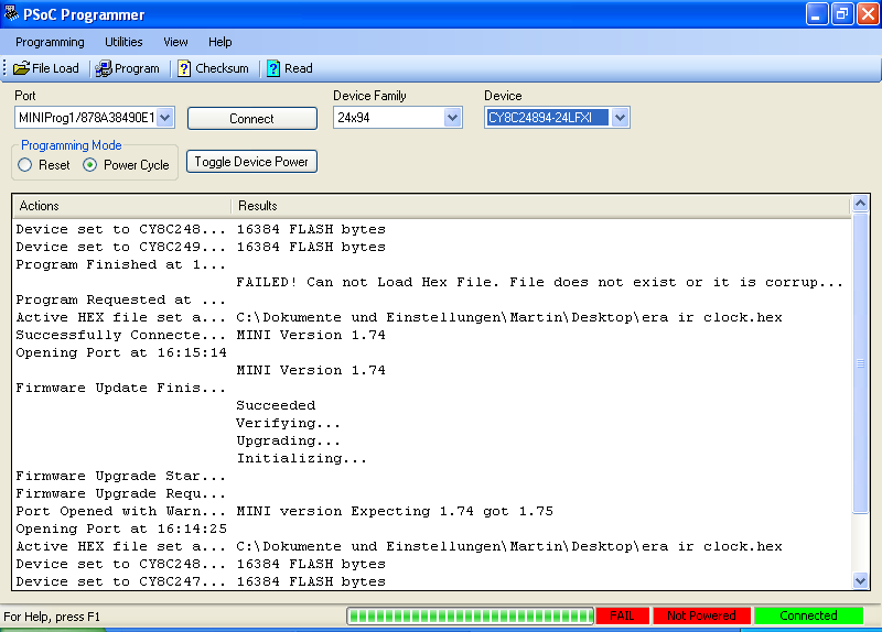 >Die Firmwares sind jeweils 32KB groß. >Laut PSoC hat der Flash nur 16 KB... Die HEX Files sind wahrscheinlich 32kB groß. Das passt dann schon mit 16kB Flash.
