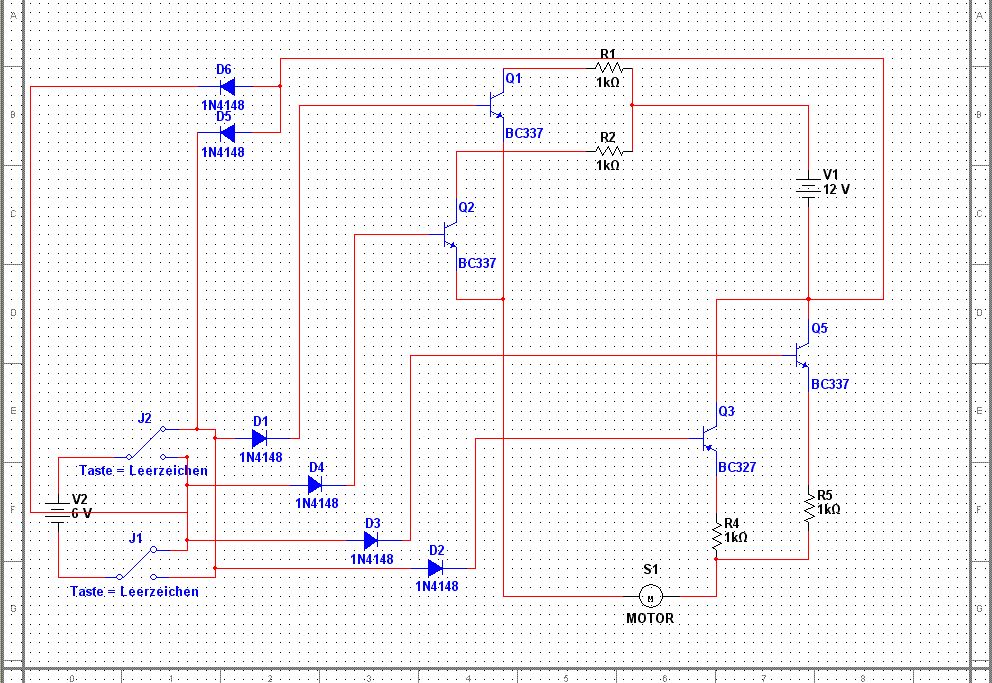@Bob -kip! Hast Du überhaupt eine Ahnung von Elektronik? Wenn ja! Warum schaltest du deine Transistoren ohne Basiswiderstand. Die Widerstände R1 - R4 ist doch Nonsens. Was um himmelswillen sollen die an dieser Stelle??? D2 und Q3 hat gar keine Funktion. Also so wie ich das sehe total keine Funktion, weil der Schaltungsaufbau blödsinn ist. sorry.. Bitte noch einmal die Birne Qualmen lassen und Zeichne einen übersichtlichen und korrekten Schaltplan.