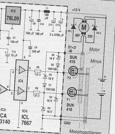 Zum Schutz der Gates reichen D3 und D4. Sie begrenzen die Gate-Source- Spannungen der MOSFETs auf -0,7V bis +16V. Die meisten MOSFETs halten ±20V aus. Der Sinn von D8/D6 und D9/D7 erschließt sich mir nicht ganz. Möglicher- weise sollen sie die Drain-Source-Spannungen begrenzen, indem sie bei Überspannung das Gate angesteuern, so dass die MOSFETs leitend werden und die Spannung abbauen. Allerdings sollte es zu diesen Überspannungen gar nicht erst kommen, da vorher die Freilaufdioden DS1 und DS2 leitend werden. Vielleicht hat jemand einer bessere Erklärung für den Sinn dieser Dioden. Wenn nicht, würde ich sie einfach weglassen, da sie bei 48V auf jeden Fall stören. Soll nur der Motor mit 48V betrieben werden oder auch der Rest der Schaltung? Der 7809 und der ICL7667 sind nämlich nicht für 48V gemacht.