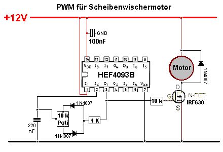 Hi, Ich hab einen Plan für eine PWM für einen Scheibenwischermotor gefunden. Da hängen aber 10k vor dem Gate. Ist das nicht ein bisschen viel? Wenn ja, wieviel sollte man dann...? Ich dachte, vor ein Mosfetgate gehören nur so um die 40 Öhmchen hin. Ach ja, und soll man statt 220nF besser nur 100nF nehmen? Oder kommt da der 4093 nicht mehr mit? Ich hab mal so eine PWM mit einem NE555 gebaut und verschiedene Kondensatoren probiert, da war ein einsamer 1nF/63V genau das richtige (da hat der Motor beim regeln auch nicht mehr gequietscht). lg Triti