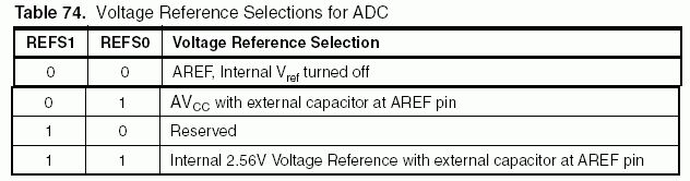 Die Tabelle aus dem Datenblatt zeigt die "Schalterwirkung" der REFS-Bits in ADMUX. Könnte es sein, dass Du noch Probleme mit Bits und Bytes hast? Also das I/O-Register (das Byte) heißt ADMUX, die darin enthaltenen Bits haben die im Datenblatt angegebenen Namen. Jedes Bit verkörpert dabei einen Schalter (zur Steuerung der Hardware). Wenn Du einen Schalter verstellen willst, dann musst Du darauf achten, dass die anderen nicht beeinflusst werden. Alternativ setzt Du alle Bits auf einmal, indem Du den entsprechenden Wert (0..255) in das Register schreibst. Die wertigkeit der einzelnen Bits im Byte sollte Dir bekannt sein (1,2,4,8,16,32,84,128), wenn nicht, dann solltest Du mal bei Wikipedia nachschlagen. Falls doch, dann entschuldige ich mich vorsorglich... ;-) Pascal machen hier Wenige, die Meisten machen C, ich bevorzuge ASM. Guten Rutsch... ~