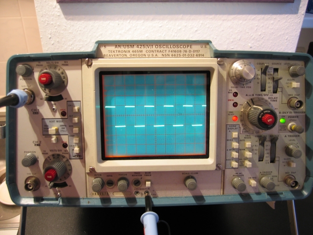 Anbei ein Foto von dem Oszi. Ich muss mich übrigens korrigieren: Schalterstellung GND funktioniert. Lediglich bei Volt/Div Bereichs-Umschaltung verschiebt sich u.U. die Y-Achsen-Ablenkung, sodaß mit dem "Position" Steller nachgezogen werden muss. Keine große Sache also. Übrigens: falls jemand Interesse an dem Gerät hat, ruhig einmal anmailen, die 100 EUR sind ja nicht in Stein gemeißelt ;-)