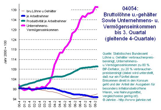 >> Dagegen waren die Reallöhnzuwächse bei den Arbeitnehmern >> bei 0 oder sogar negativ. >Da sagt sogar Deine Grafik aber anderes. Außerdem dürfte es sich dort um >die Zuwachsraten der gesamten Lohn-/Gehaltsumme handeln. Und bei deren >Verteilung auf die einzelnen Einkommensbezieher ist die Demografie nicht >ganz unwichtig. Die Grafik sagt, das bis Ende der 80er Jahre die Arbeitnehmer tatsächlich noch am Aufschwung beteiligt wurden. Ich möchte ja auch nicht alles schlechtreden. Aber in den letzten Jahren läuft doch etwas gewaltig aus dem Ruder. Die schlimmsten Exzesse sind dort ja noch garnicht erfasst, ich suche mal eine aktuelle Grafik. Meinst du mit Verteilung, die Verteilung aus meiner angehängten Grafik? Was hat die Demografie damit zu tun? >Das überproportionale Wachstum des Vermögens wiederum hat mit dem ebenso >wachsenden Kapitalbedarf pro Arbeitsplatz zu tun. Hätte z. B. Merckle >die verzockten Millionen in Form von "Geldvermögen" (wie die Grafik >suggeriert) herumliegen gehabt, müsste nicht jetzt mindestens eines >seiner Unternehmen verkauft werden. Diese Grafik suggeriert garnichts, mit Geldvermögen ist die Geldmenge M3 gemeint. Was meinst du mit herumliegen? Unter dem Kopfkissen? Die Kapriolen der VW Aktie, bei denen sich Merckle "verzockt" hat, haben mit der Realwirtschaft rein garnichts zu tun. >> Nur gebe es dann auch keine "Schirme" und "Pakete" und der Finanzsektor >> wäre schon lange völlig kollabiert. >Zu dem Thema gibt es unterschiedlichste Meinungen. Ist die staatliche >Geldpolitik überhaupt erst Schuld an den Exzessen? Ist so ein Kollaps >(letztlich Staatsbankrott) systemimmanent? Wir (oder unsere Nachkommen) >werden es sehen ... Die staatliche Geldpolitik würde ich eher als staatliche Schuldenpolitik bezeichnen. Der Staat ist aber eher Lender of last resort. http://de.wikipedia.org/wiki/Lender_of_last_resort. Der Fehler ist meiner Meinung nach systemimmanent, ob Goldstandard oder nicht. Um nochmal auf das ursprüngliche Thema Hartz4 zurückzukommen. Für alle die, die immer noch denken es gäbe genug Arbeitsplätze in Deutschland. Deutschland ist oder war Exportweltmeister. Das heißt in DE werden mehr Waren hergestellt als wir verbrauchen. Das heißt aber auch das Deutschland seine Produktivität und damit seine Arbeitslosigkeit exportieren muss. (dieser Export bricht im Moment massiv weg, Masch.Bau -30%) Diese "überflüssige" Arbeitskraft wird im Moment doch nur noch verwaltet. Das hat nichts mehr mit den Gesetzen des Marktes mit Angebot und Nachfrage zu tun. mfg