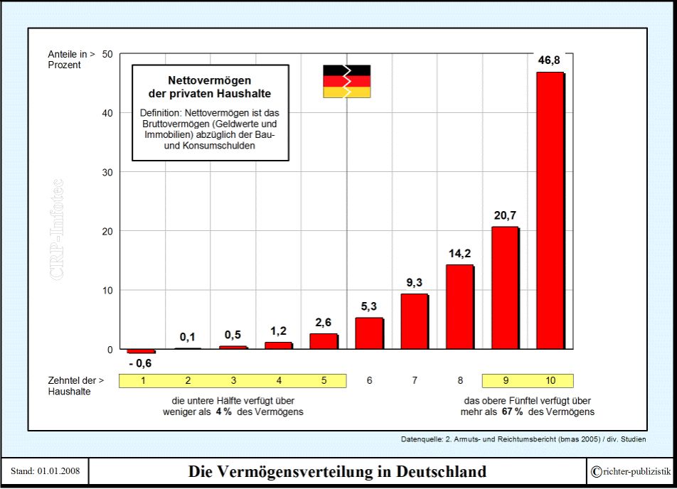@Zardoz Der Trickle Down Effekt ist ein frommer Wunschtraum der Ökonomen. http://de.wikipedia.org/wiki/Trickle-down-Theorie Du meinst wenn das Pferd mehr Hafer frisst, können die Spatzen mehr Körner aus dem Endprodukt der Verdauung picken. Welch einfaches Weltbild. Ausserdem völlig falsch, wie hier auch schon richtig festgestellt wurde, ist unser heutiges (Finanz)System ein riesiger Staubsauger der die Vermögen von unten nach oben saugt. Da gibt es doch garnichtsmehr herumzudeuteln. Für dich extra nochmal die Charts. Hartz 4 ist nicht die Ursache, sondern das Symptom. Aber es ist ja auch immer so einfach nach unten zu treten. Versteht eigentlich jemand die Ironie an der heutigen Situation? Erst gönnt man dem "Harzer" nicht die Butter auf dem Brot(nicht wahr Herr Sarazin) und jetzt sollen alle auf Teufel komm raus Konsumieren um die Binnenkonjunktur zu stützen. Das ist ganz grosses Kino was im Moment in Berlin abgeht. 2009 wird bestimmt noch in interessantes Jahr. mfg