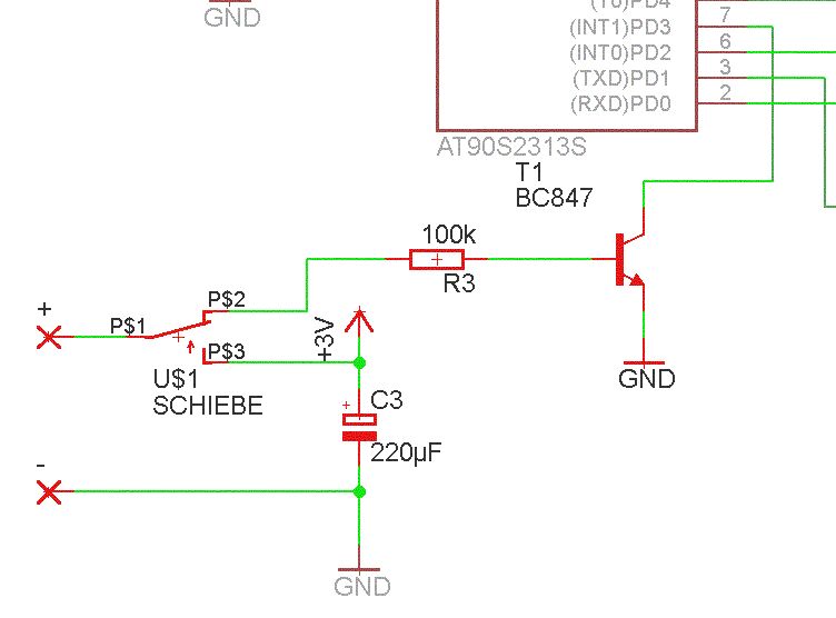 das ganze hängt an einer batterie schalte ich ein dann bekommt der µc spannung und der kondensator lädt sich auf wenn ich dann mit dem schalter ausschalte dann wird mit dem zweiten kontakt der transistor durchgeschaltet. selbst wenn ich die ce strecke überbrücke mit dem strommessgerät reagiert der interrupt nicht.